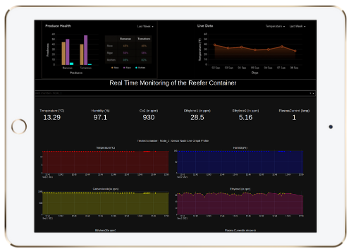 his device monitors the internal condition of a reefer container and streams the temperature, relative humidity, CO2 and ethylene signatures to the cloud. The pretrained AI module in the cloud predicts the quality level of the fresh produce inside the container. Currently, the pretrained model for the mango is ready. Model for any other product can be prepared as per requirement.